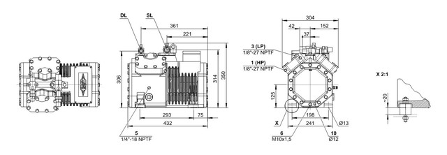 | Об'ємна прод-ність (1450 об/хв 50 Гц) Кількість циліндрів х Діаметр х Ход поршня Напруга мотора Максимальний робочий струм Пусковий струм (ротор блокований) Вага Макс. надлишковий тиск (НД/ВД) Приєднання лінії всмоктування Приєднання лінії нагнітання Тип оливи для R134a/R404A/R507A/R407C Тип оливи для R22 (R12/R502) Тип оливи для R290/R1270 Заправка оливи |